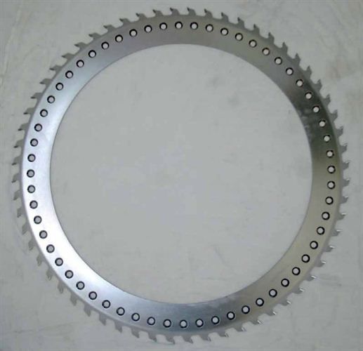 Tct circular segments and toothed outer circles (diameters, thicknesses and borings on drawing) for canters. Mass-produced toothed crowns for chipping machines.
